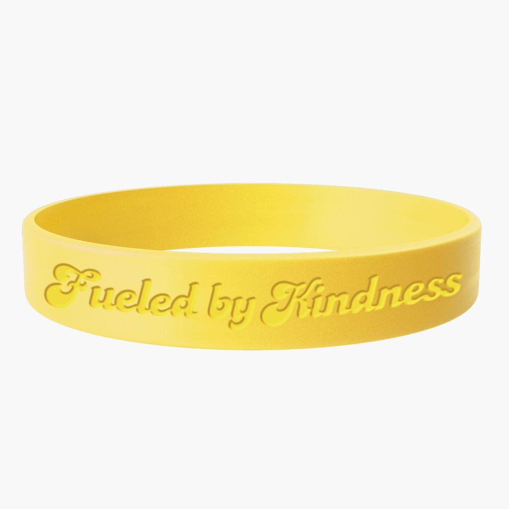 Debossed imprint of our Fueled By Kindness messaging repeated around the band.