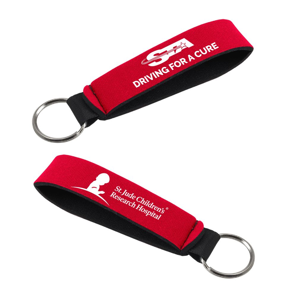 sku: n0635_SJHigh-quality neoprene (wetsuit material), wrist strap key holder with key ring. This red key holder is imprinted with the STA and St. Jude logos and the DRIVING FOR A CURE messaging.